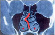 下の患者さんは、右に凸の鼻中隔彎曲症です(オレンジ太線)。また、特に左側に肥厚性鼻炎を認めます。
